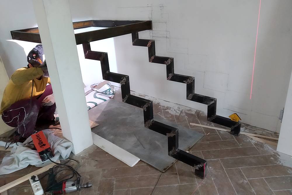 Косоуры приварили к швеллеру снизу. Сначала мне хотелось сделать этот узел крепления иначе: чтобы они опирались на швеллер сбоку, а не висели под ним на сварочном шве. Но в этом случае нарушались расчетные параметры лестницы, поэтому оставили так.