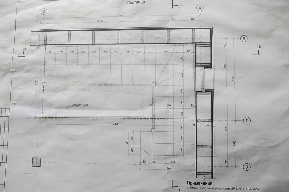 Новая лестница планировалась в дальнем углу, справа от книжных полок. Там в потолке оставлен Г-образный проем, его еще называют «второй свет»  Проект Г-образной лестницы с забежными ступенями прилагался к архитектурной документации дома. На нижнюю часть лестницы отводилось примерно 2,7 м вдоль стены, на верхнюю — 3,5 м