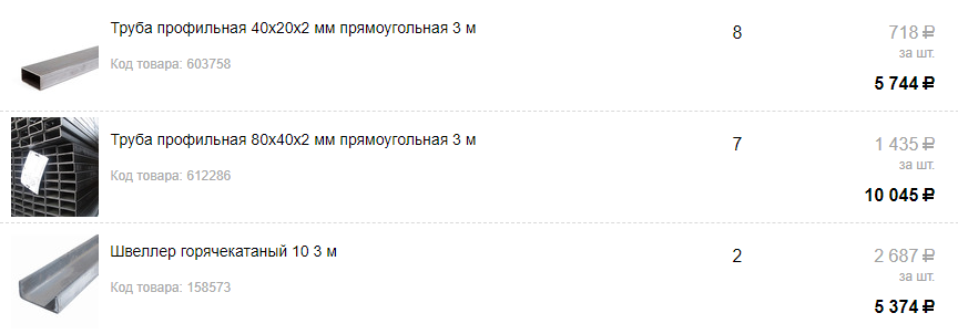 За семь металлических профилей и два швеллера для площадки я заплатил 15 419 Р, плюс 1000 Р за доставку
