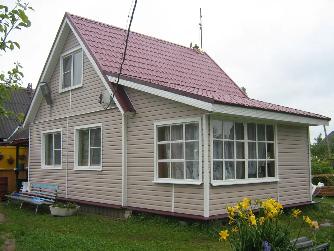 - Синяя крыша сочетается с сайдингом белого и желтого цвета.