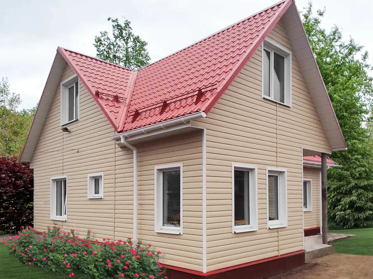 Цветовая схема. Красная крыша является ярким акцентом, поэтому сайдинг должен гармонировать с ее цветом. Рекомендуется выбирать нейтральные оттенки, например, белый, серый или бежевый, чтобы создать сбалансированный образ.