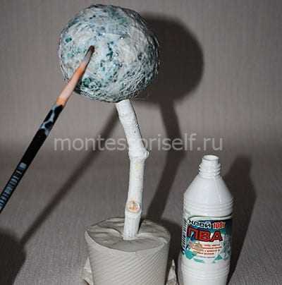 Шаг 5. Когда получившаяся крона высохнет, поработайте над пробелами. Для этого нужно обработать клеем пустоты и снова их присыпать крупой.