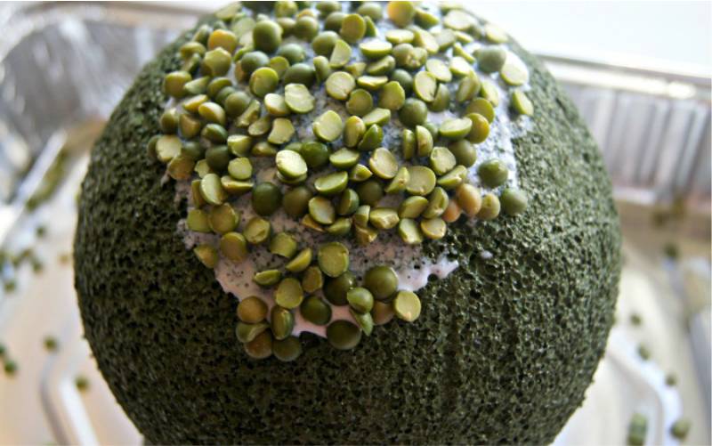 Дайте этому участку немного подсохнуть и приступайте к обсыпке следующей части шара. Продолжайте процедуру до тех пор, пока весь шар не обрастет зеленым горошком, а затем оставьте его на ночь сохнуть.