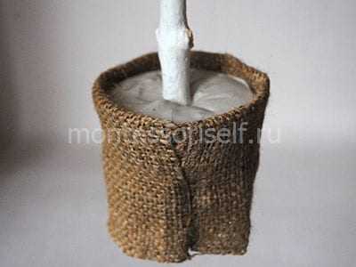 Оборачиваем этой мешковиной стаканчик, размещая сгиб вверху.
