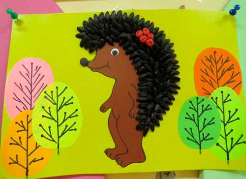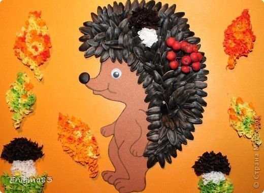 Сама работа начинается с поиска поверхности, которая будет задекорирована и каким способом. Семечки подсолнуха очень удачно смотрятся в изображениях птиц и животных. Например, ежик из семечек, он может быть в виде фигурки или картины. Для первого варианта необходимо: горстка семечек, кусок пластилина и немного фантазии. Из пластилина лепится грушевидная заготовка – тело ежика. Затем, начиная с середины заготовки, втыкаем семечки, примерно половину погружая в пластилин. Почти все готово, осталось сделать носик и глазки и ежик готов. Его можно поместить на лесную полянку, в компанию к другим животным, все зависит от вашей фантазии. Если это картина, то потребуется фон – картон, лист бумаги, клей, кисточка.