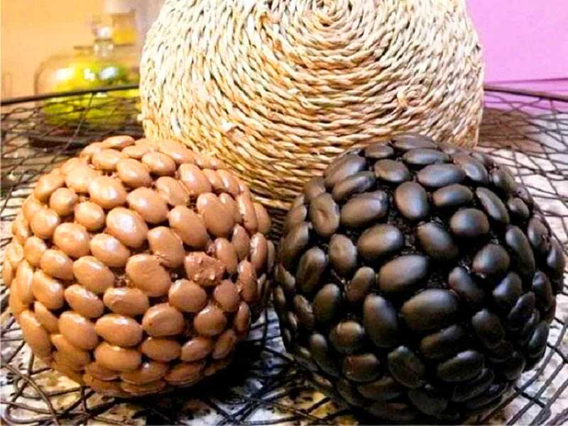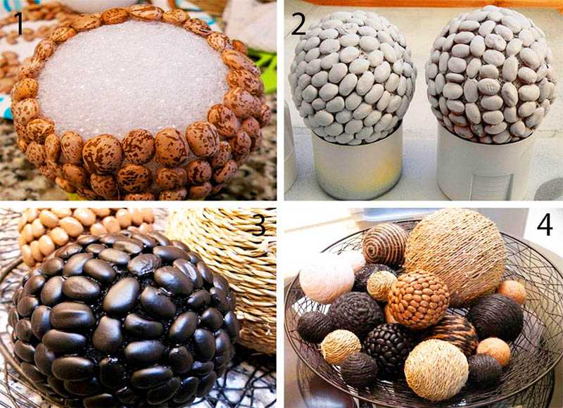 Аналогичным образом можно украсить декоративные интерьерные шары. Желательно использовать основу из пенопласта разного диаметра и несколько видов круп, а также бобовые.