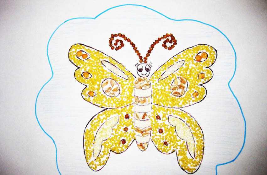 На картоне нарисуйте или переведите картинку. Можно приклеить вырезанное изображение из раскраски. Намажьте клей по контуру вашей картинки и засыпьте этот участок крупой, лишнее стряхните. Семена, горох приклеивают по отдельности. Чтоб работа дольше сохранилась, нанесите на нее лак для волос.