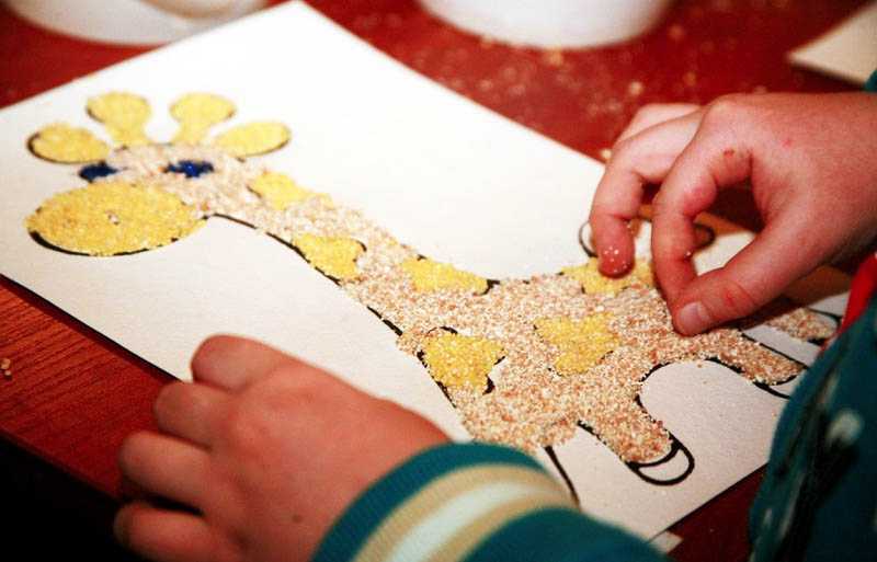 Занятия крупами для детей первоначально происходит в форме игры, позволяющей развивать воображение и мелкую моторику. С возрастом шаблоны постепенно уходят на второй план, и дети начинают экспериментировать самостоятельно. Если комбинации из круп, макаронных изделий и семечек уже освоены, можно добавить к этому чаи и другие элементы рукоделия – ленточки, бусинки, разноцветные нитки.