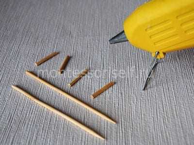 Берем две деревянные шпажки для шашлыка. Одну разламываем пополам, вторую ломаем на небольшие кусочки.