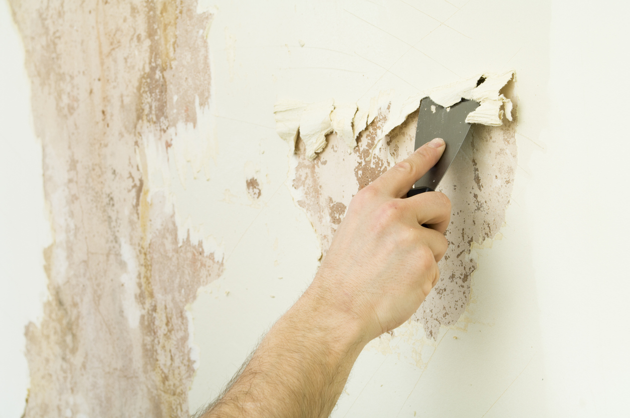 Если стены в квартире покрыты краской или обоями, нужно полностью удалить старый слой. Обои удаляют, щедро смачивая их поверхность мыльной теплой водой с помощью губки, а затем шпателем снимают их по полосам. Старая краска иногда является настоящей проблемой, так как случается, что в некоторых местах она вздулась и пузырится, отваливаясь при прикосновении, а в других — прилипла намертво. Но удалить весь слой нужно все равно, так как шпатлевка не прикрепится к поверхности краски и выровнять стену не получится. Работать нужно обязательно в респираторе и защитных очках. После удаления декоративного слоя, следует оценить качество штукатурки. Для этого требуется внимательно прислушиваясь, простучать ее ручкой шпателя. В местах, где слой штукатурки из-за сырости или нарушения технологии производства работ отошел от стены, звук изменится. В таких зонах нужно отбить старую штукатурку, чтобы впоследствии заполнить неровности стартовой шпатлевкой.