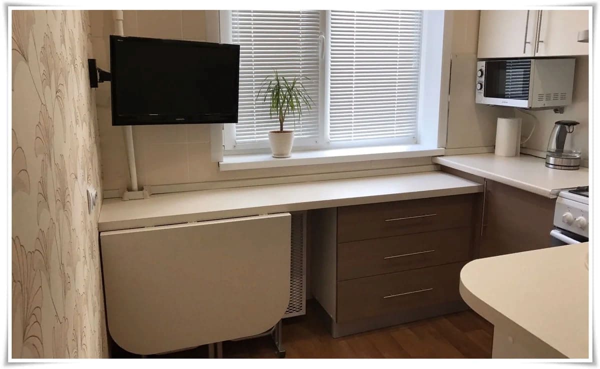 Столешница-подоконник, продолжающая рабочий стол на кухне Источник roomester.ru