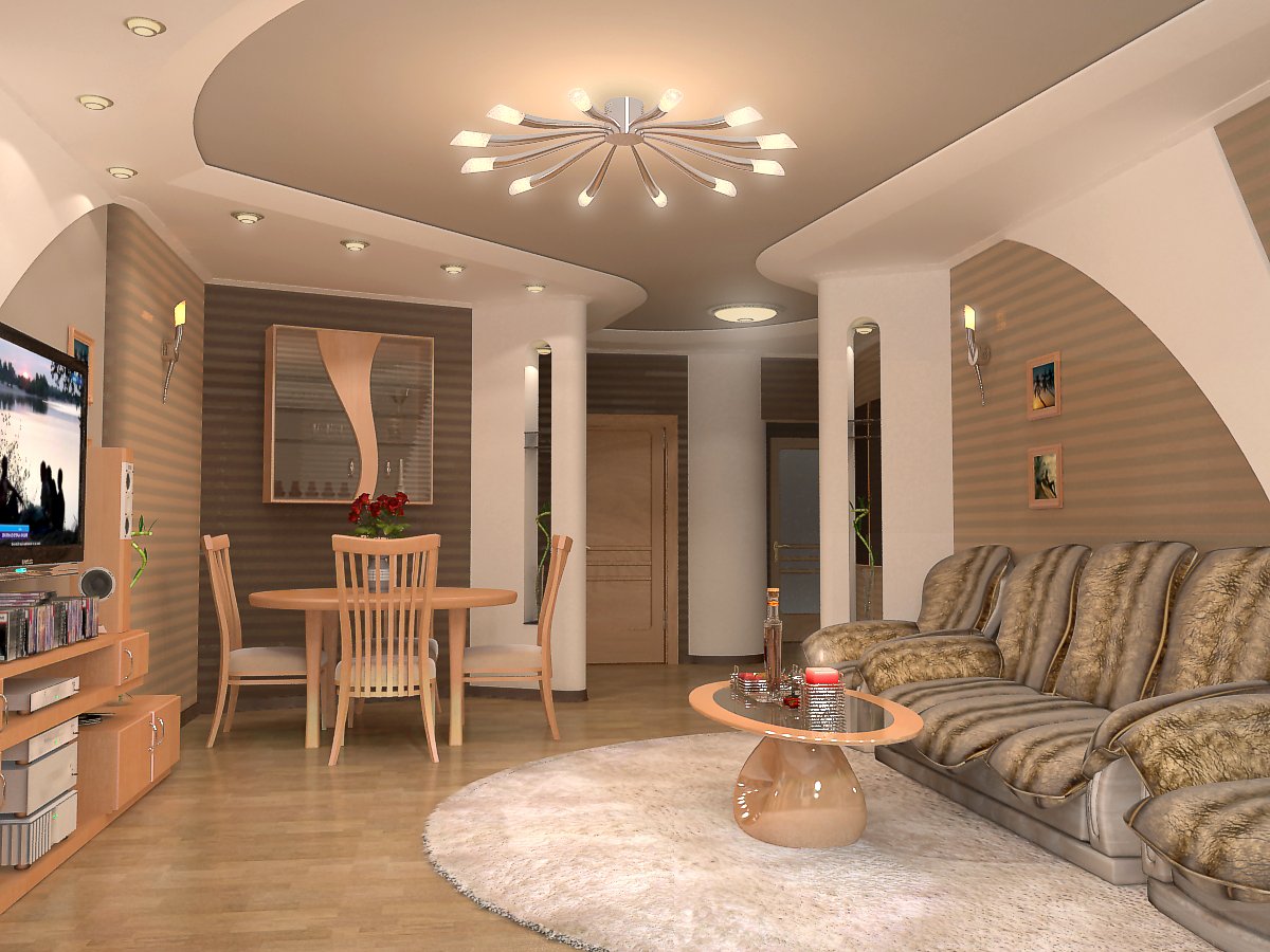 Какие же особенности помещения необходимо учитывать, планируя дизайн потолка в зале? Этой комнате отводится особая роль в жизни семьи, она должна быть и функциональной, и достаточно парадной: