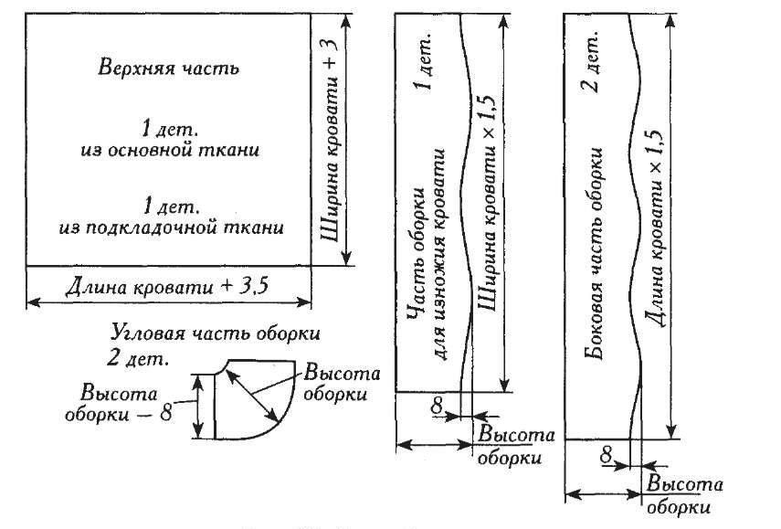 При расчетах размера оборки пользуйтесь правилом: длина ткани по боковым сторонам должна быть больше длины кровати в полтора или два раза. А если хочется пышности, то стоить немного, увеличить длину, и тогда оборка будет смотреться более нарядно.