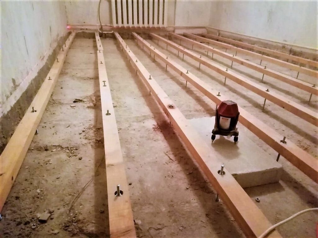 - После монтажа лаг плоскость выверяется по шнурке, либо пузырьковому уровню.