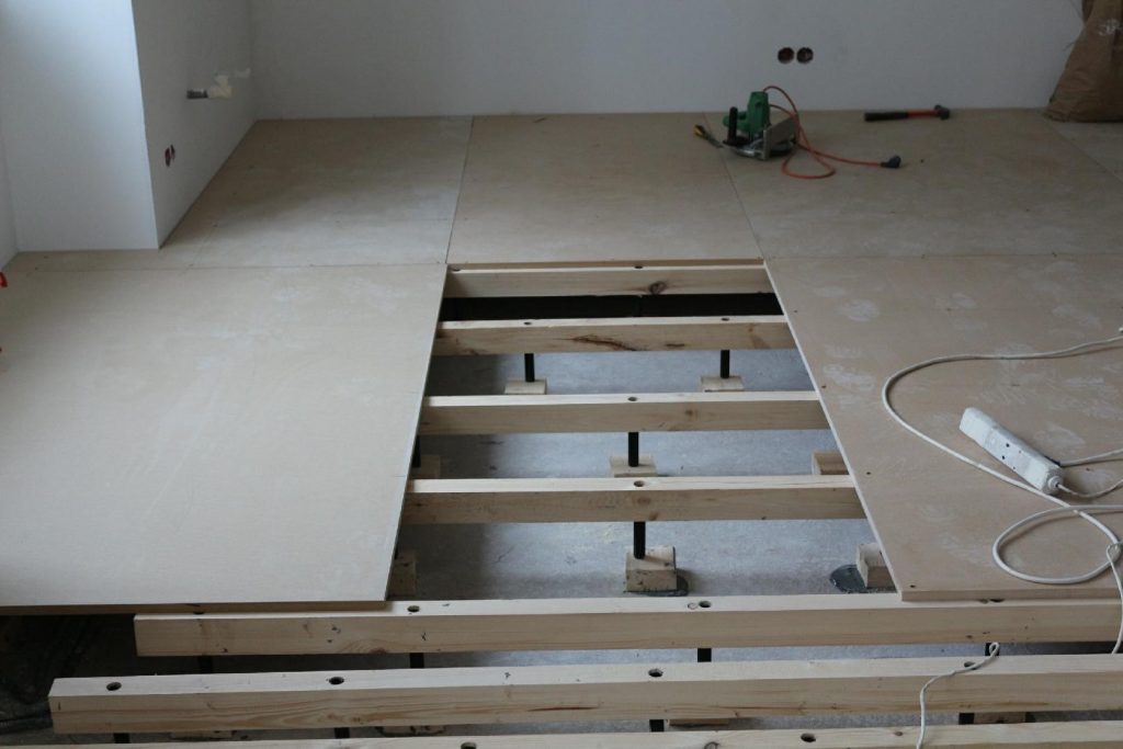 При укладке на дощатый настил сверхтвердой древесноволокнистой плиты для обеспечения гидроизоляции доски пола укладывают плотно и ровно, на них наклеивают плиту на казеиново-цементном клее или специальной мастике. Затем на сутки плиту равномерно в нескольких