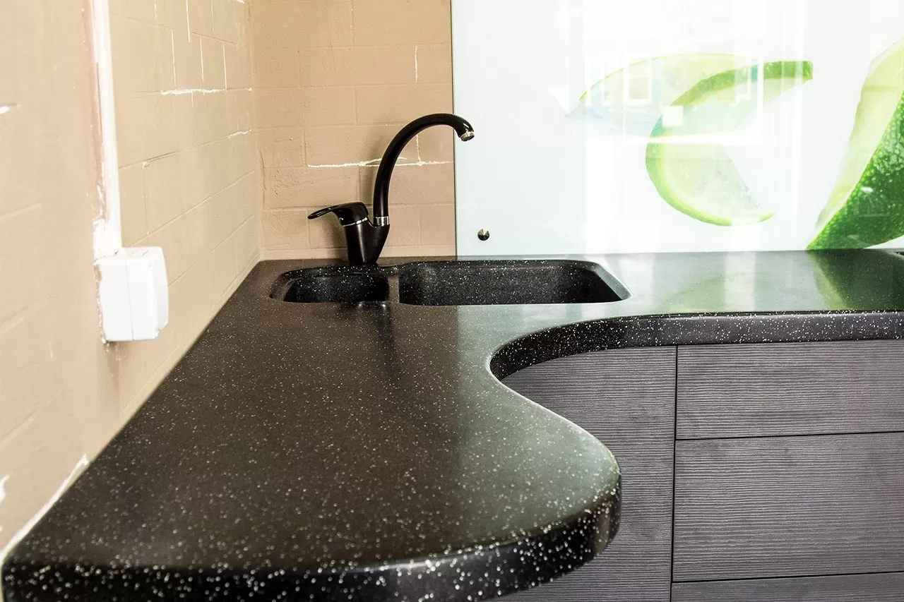 Агломерат — еще один композит, но в его структуре 90% и более приходится на каменную крошку — мраморную, кварцевую либо гранитную. В качестве связующего ингредиента используется полиэфирная смола, подобная комбинация придает материалу особую прочность и крепость. Для максимальной схожести с природным материалом в смесь вводят зеркальные частицы и красящие пигменты.