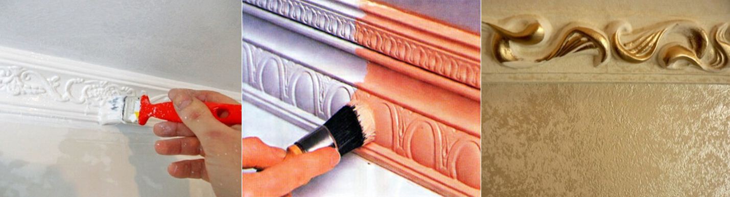 Совет: если галтели имеют красивый рельеф, то их детали можно подчеркнуть бронзовой краской, имитирующей позолоту. Однако в данном случае аналогичные золотистые элементы декора должны присутствовать в интерьере комнаты.