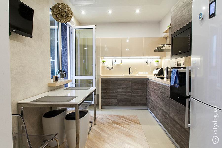 Если гарнитур длинный, то места хватит не только для всей необходимой бытовой техники, но и для телевизора.