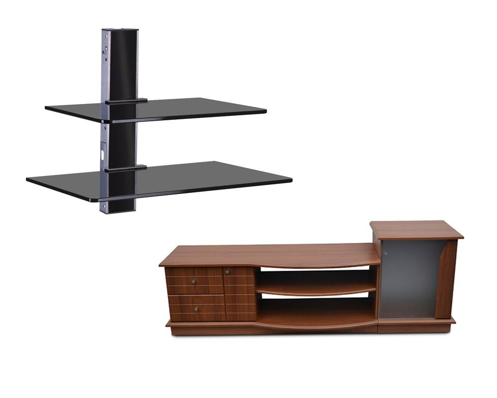 Полки на стену под аппаратуру подходят для любого помещения, они имеют специальные крепления, это отличный вариант, когда не хочется загромождать помещение большими тумбочками для техники, а установить устройство необходимо. Для производства таких полок используют прочный материал, его толщина составляет 15 мм, он способен выдерживать нагрузки до 15 кг. В стеклянном исполнении это может быть классическая, темная или матовая поверхность.