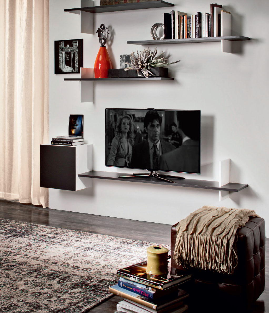 Сейчас фирмы все больше отходят от тенденции создания мебельных стенок с нишами для ТВ, так как современный человек, старается не загромождать пространство лишней мебелью, освобождая его. Большое количество мебели в комнате сковывает пространство, что вызывает психологический дискомфорт у проживающих в квартире. Поэтому небольшая полка на стене будет смотреться куда выигрышнее.