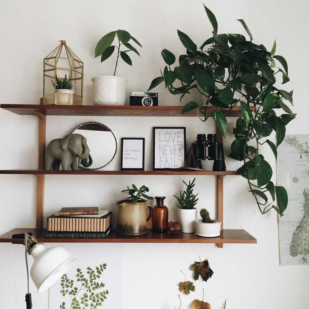 - Естественные материалы популярны при оформлении. Для добавления оригинальности расставьте растения на полках. Подвесные или поставленные, на полки горшки с растениями, сделают комнату эффектной.