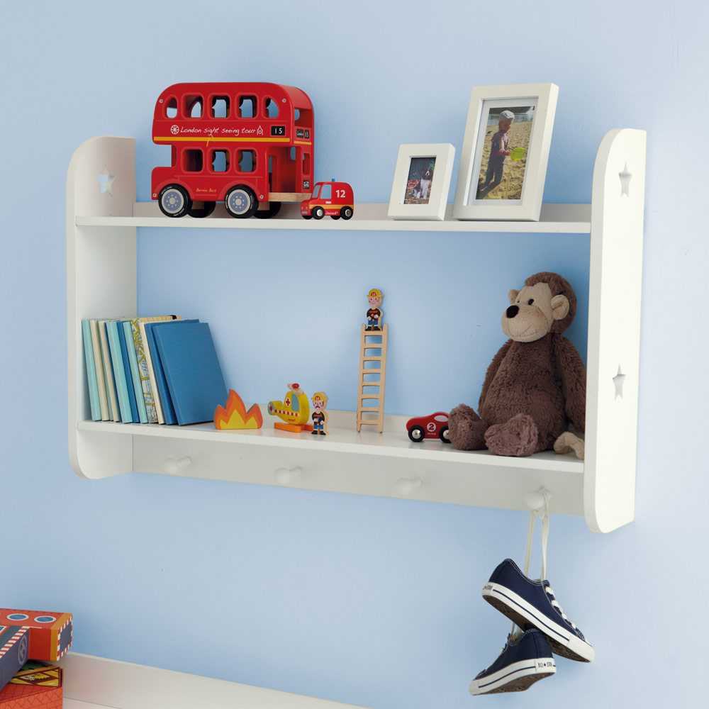 В оформлении данной комнаты, в первую очередь уделяют внимание безопасности и функциональности конструкции. Для детей в основном выбирают более яркие и красочные модели, а для новорожденных полочки по форме напоминающие облако, домик или буквы