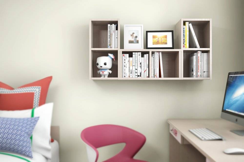 - Для детей среднего и старшего возраста требуются полки для хранения школьных и письменных принадлежностей, книг и других вещей. Также для большего удобства вблизи или над письменным столом крепятся настенные или угловые полки.