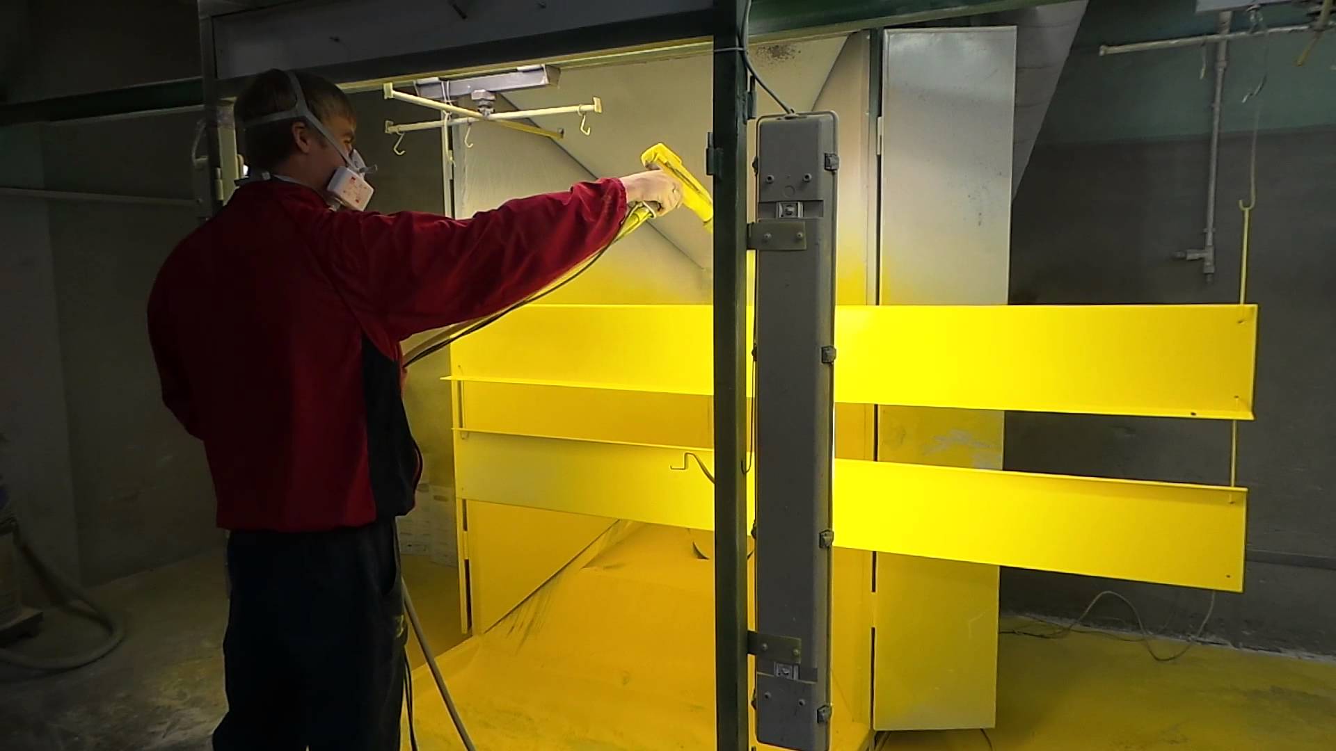 Данный этап проводится на базе специального оборудования для порошковой покраски. Напыление порошка проходит в камере-распылителе, работающей по электростатическому принципу. Осуществляют покраску при помощи специального пистолета.