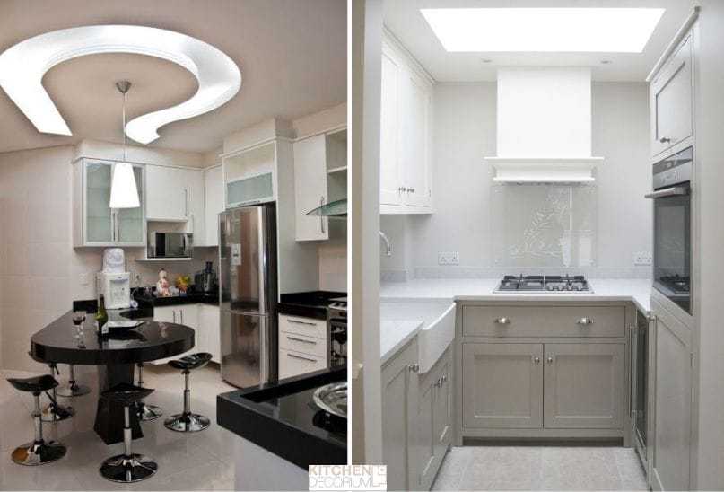 Владельцы маленьких кухонь переживают, что комбинированный потолок будет выглядеть массивно. Такое возможно, но легко избежать, если подобрать правильную форму гипсокартону. Например, если пустить его тонкой полосой по периметру, то он зрительно только увеличит потолки, даже если их высота всего 2,5 метра.