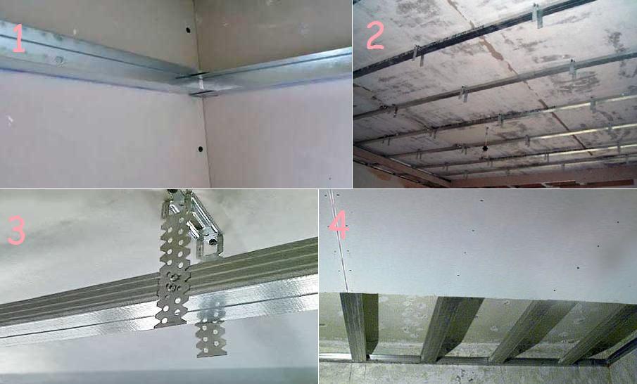 - каркас сооружается из металлического профиля нескольких видов. Представляет собой решетку, закрепляемую на стене – в направляющий профиль, и на потолок – с помощью П-образных подвесов. Такая конструкция позволяет скрыть за гипсокартонной поверхностью коммуникации, замаскировать любые недостатки базового потолка и придать комнате необычную форму – например, арочный потолок;