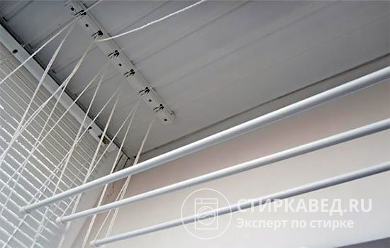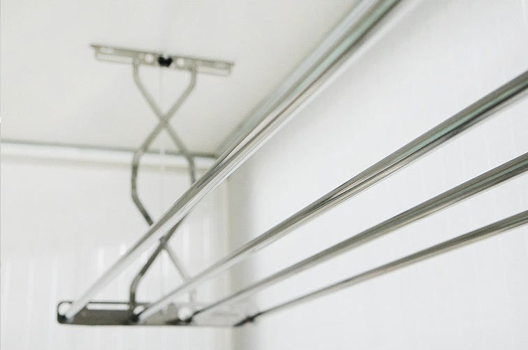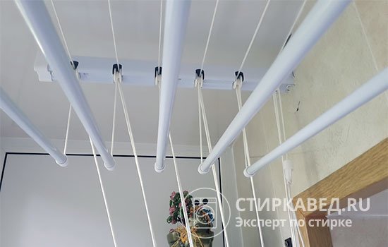 Потолочные сушилки пользуются огромной популярностью благодаря удобству их использования. Если выполнить монтаж правильно, такая конструкция прослужит довольно долго. При этом необходимо периодически протирать стержни влажной губкой, чтобы избежать загрязнения белья во время сушки.