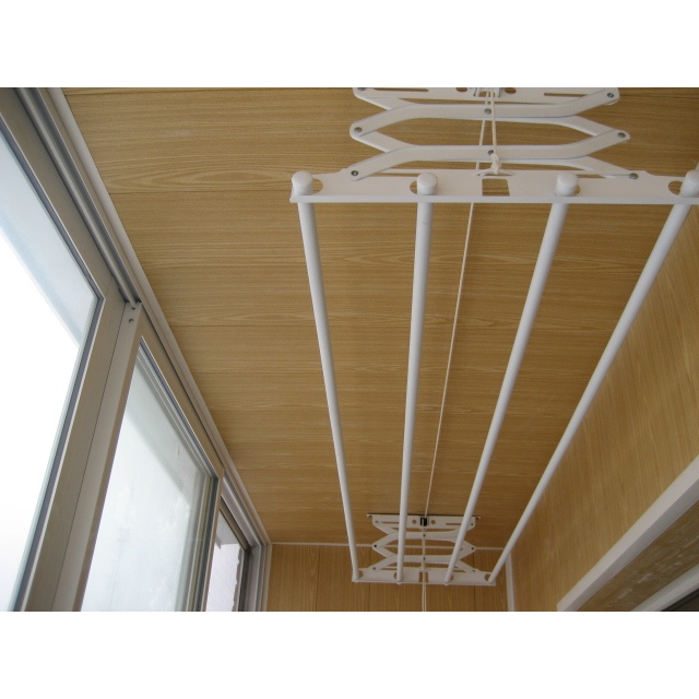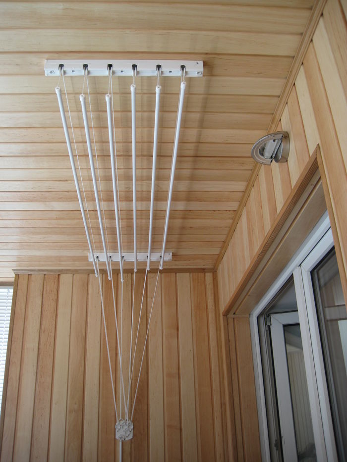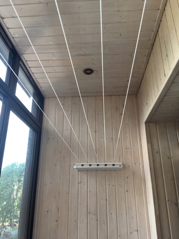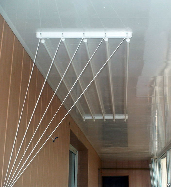 Также, как напольные и настенные сушилки для балкона, потолочное устройство может обладать складной конструкцией. Однако преимущество складного механизма, в данном случае, не в экономии места, а в ручной регулировке длины бельевой веревки. При этом, потолочная сушилка для белья практически не имеет недостатков. Поэтому целесообразно будет остановить свой выбор именно на этом варианте.