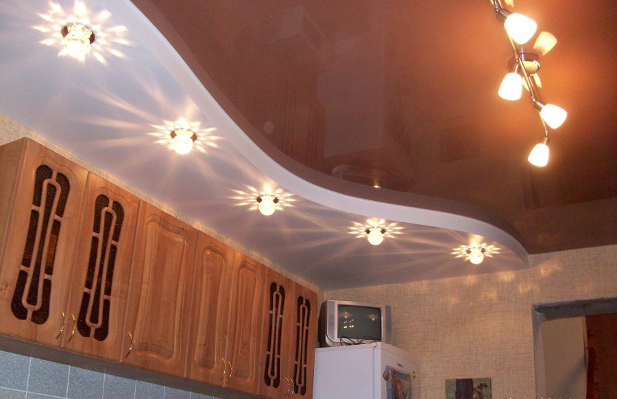 Двухуровневые глянцевые конструкции отражают свет, визуально увеличивают пространство и высоту, что важно для отделки в маленькой кухни;