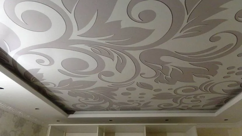 Разнообразить интерьер поможет добавление рисунков на полотно. Мелкий принт приподнимет потолок, а крупный сделает его более низким.