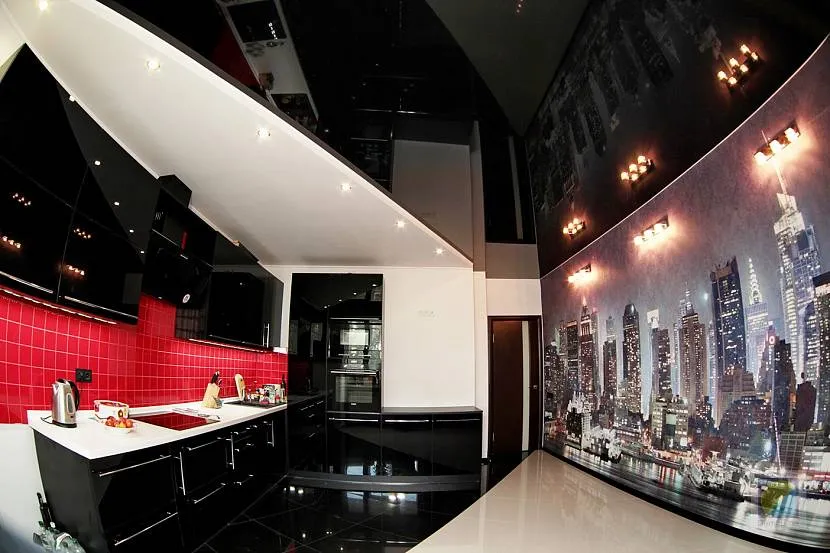 Темный глянцевый потолок на кухнеИсточник Деми-Луне