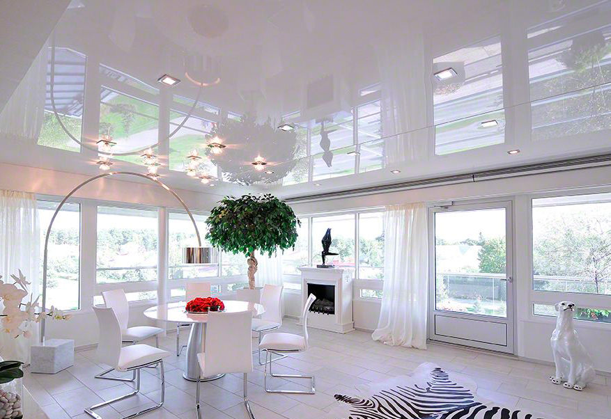 Глянцевый потолок бликует и обладает высоким коэффициентом отражения, а это значит, что многие крупные предметы будут отражаться в нем, как в зеркале, хоть и не с такой точностью и яркостью. Некоторым потребителям это может не понравиться, ведь комната всегда должна находиться в идеальном порядке. Есть и преимущества. Глянец визуально увеличивает объем помещения.