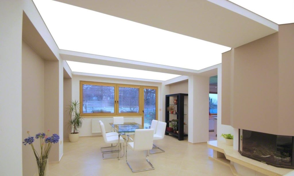 Также есть полупрозрачные натяжные полотна. Этот вариант считается эксклюзивным. За ним сложно спрятать проводку и какие-то недостатки, поэтому подходит он исключительно для идеально ровных поверхностей.