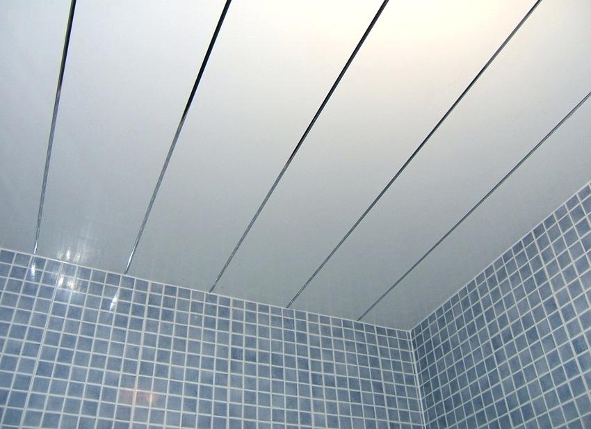 Панелями обшивают деревянную или металлическую обрешетку. Практичность и долговечность отделки определяет качество используемого пластика. Если потолки в ванной комнате решено сделать из пластиковых панелей, нужно учесть, что материал достаточно хрупкий и даже после легких ударов, могут появиться вмятины и трещины, после которых он не подлежит восстановлению. На строительном рынке представлен широкий выбор панелей разных размеров, расцветки и фактуры. В отличие от стеновых, потолочные намного легче и тоньше.