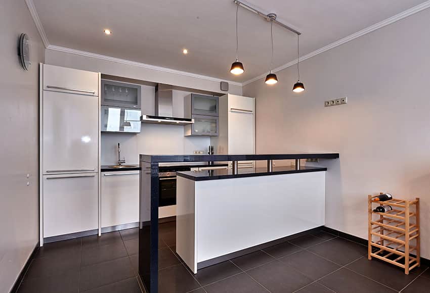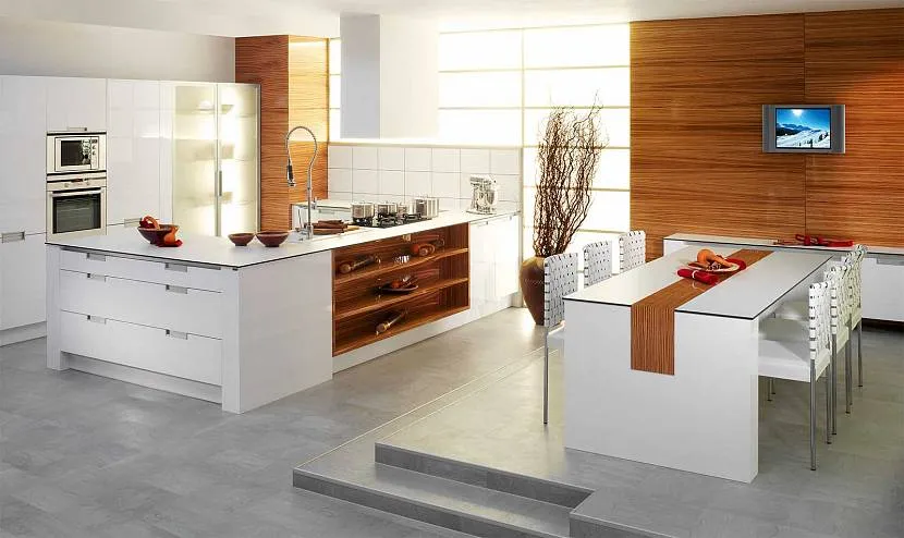 Помимо гарнитура и обеденного участка ставят остров или барную стойку, разделяющую рабочий участок комнаты от обеденного пространства. Остров может стоять посередине помещения, а может примыкать к корпусной мебели в качестве барной стойки.