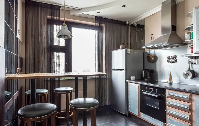 Отдельная обеденная зона — круглый, овальный или прямоугольный стол со стульями или диваном. Место для него можно оформить в центре комнаты, у торцевой стены (у окна), у противоположной гарнитуру стены. Сэкономить место на кухне можно за счет раскладного стола — это вариант для небольшой семьи, у которой часто бывают гости. Встроенная в гарнитур зона для приема пищи — это барная стойка или стол-подоконник. Эти варианты подходят для небольшой семьи, которая не часто принимает гостей. Или как место для будничных ужинов, при наличии отдельной столовой. Если в кухне есть утепленный балкон, можно сделать барную стойку на подоконнике, предварительно убрав стеклопакет с дверью.