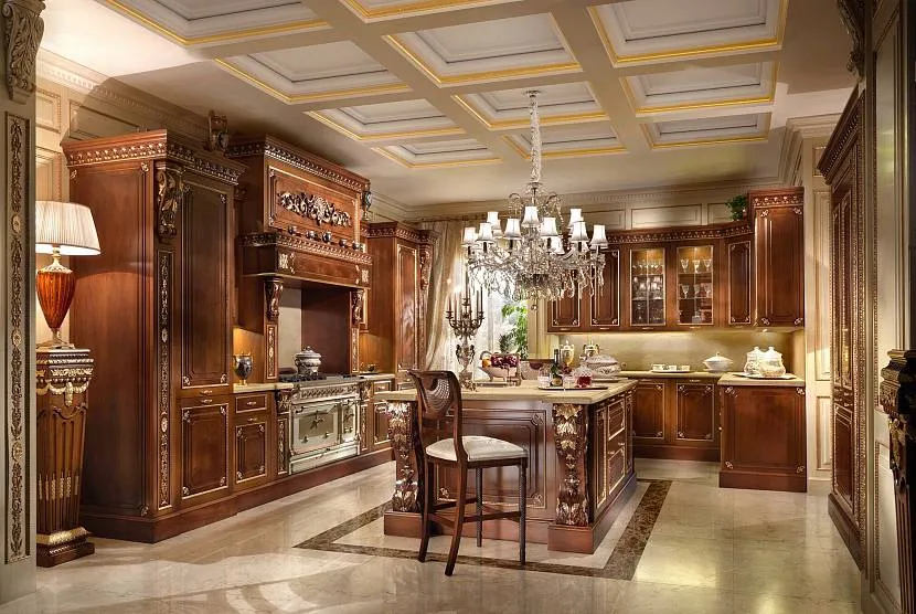 Доминирующим материалом выступает МДФ, имитирующая разнообразные породы дерева. Обязателен декор, придающий гарнитуру праздность.