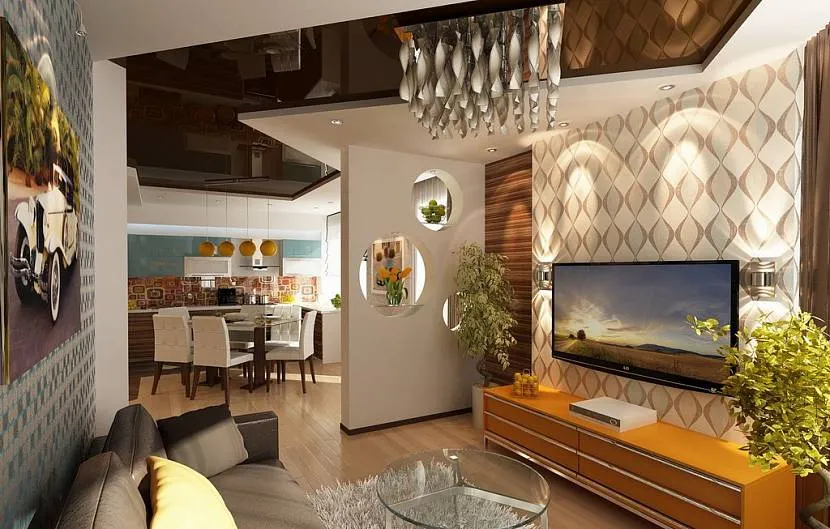 Чтобы получить функциональный дизайн квадратной или прямоугольной кухни-гостиной 14 м кв., используют разные дизайнерские хитрости: