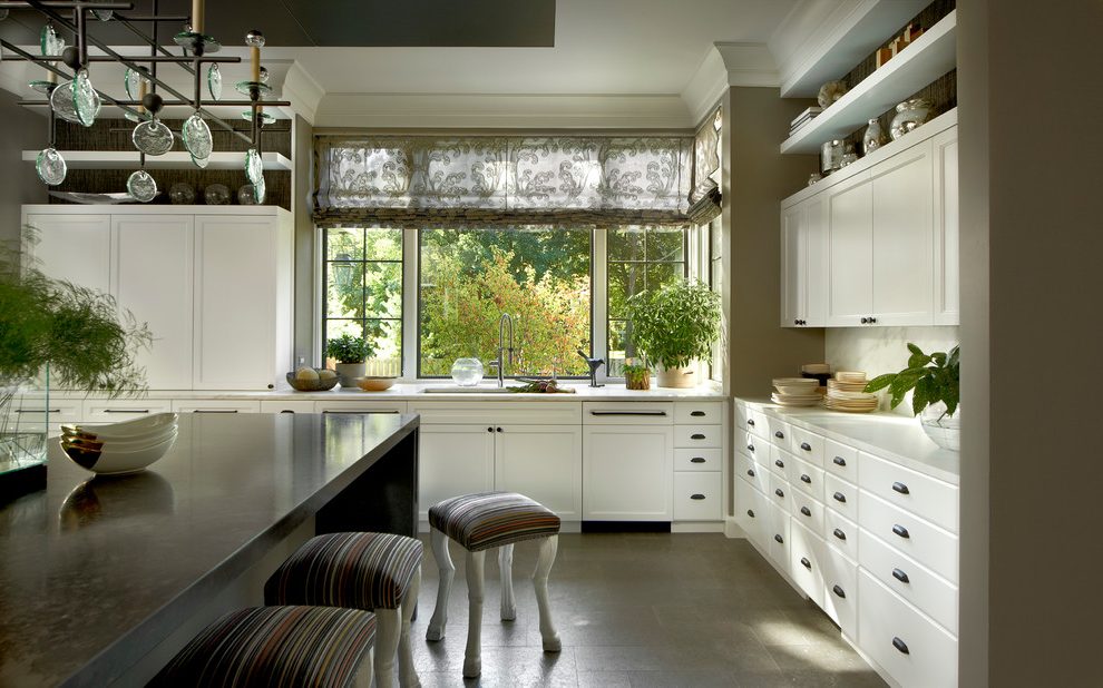Если же метраж кухни значительный, расстановка мебели может быть разной. В этом случае удобным будет угловое Г- образное расположение кухонного гарнитура. Рабочая зона может быть оборудована и вдоль трех стен кухни, создавая П- образную кухонную стенку. Угловое расположение считается самым лучшим для любой кухни, так как благоприятно для функциональности кухни и освобождает больше свободного пространства за счет глубины угловых шкафов. Может быть использован и островной способ организации кухонного пространства с вынесением отдельных кухонных элементов в центр помещения, например разделочный стол, варочная панель и мойка. Интересным является и вариант оборудования подоконника, расположенного в торцевой части кухни под стол, с удобным местом хранения и дополнительно освободившимся пространством.