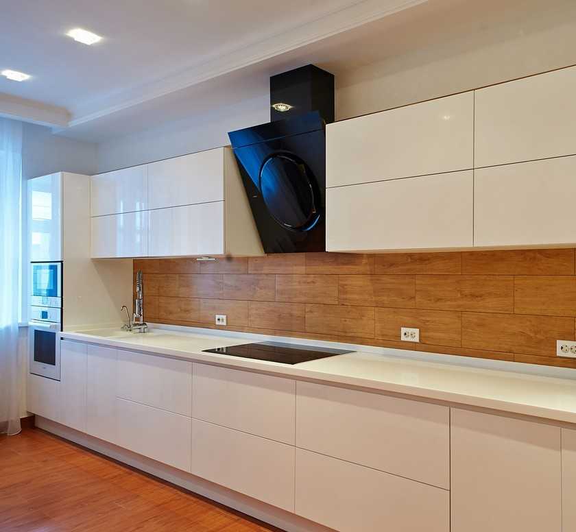 Прямая кухня – самый лучший вариант планировки, подходящий для любых помещений. Если длина хотя бы одной кухонной стены составляет не меньше 3 метров, вы можете смело выбирать такой вариант – линейная кухня позволит вместить всю необходимую технику, посуду.