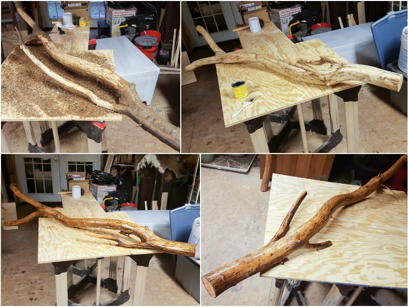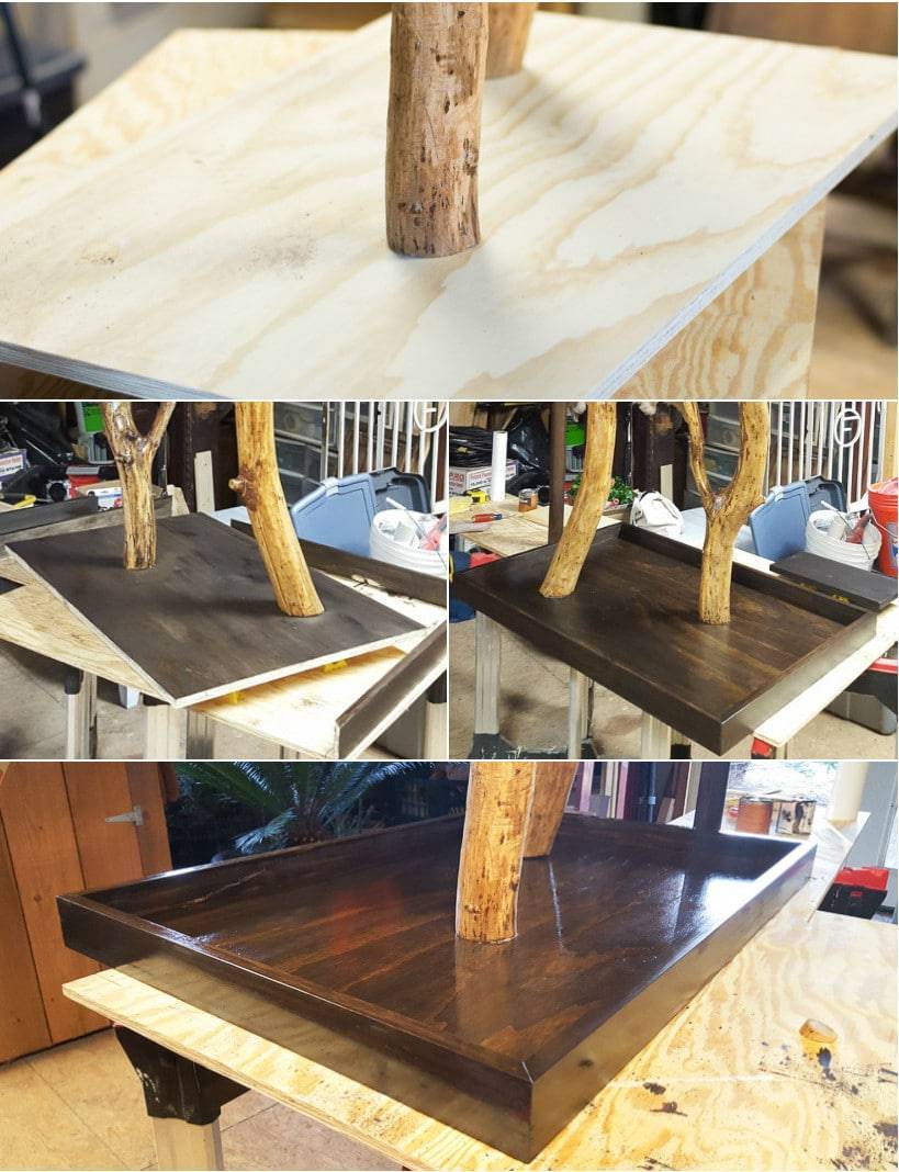 Предварительно сверлим отверстия в соответствующих местах. Затем крепим ветки к фанере (нашей базе), используя винты и жидкие гвозди внизу каждого ствола. Далее выстраиваем сосновые бортики по периметру. Завершаем полиуретановым и глянцевым покрытием.