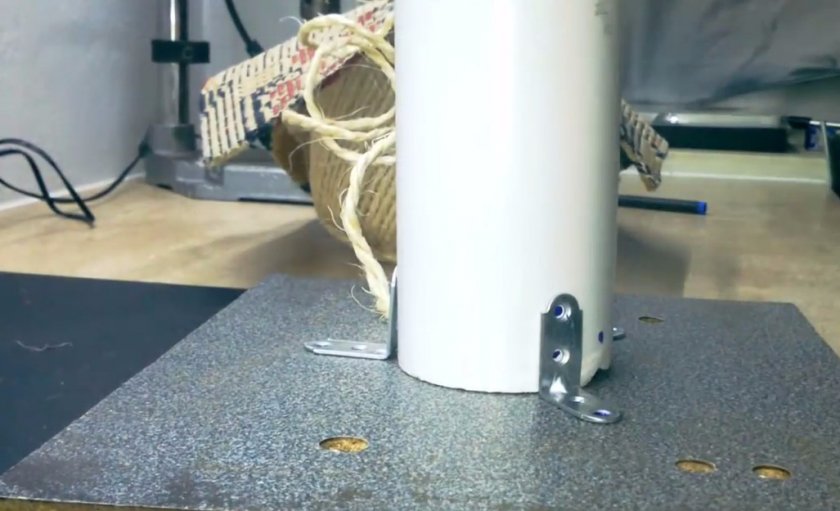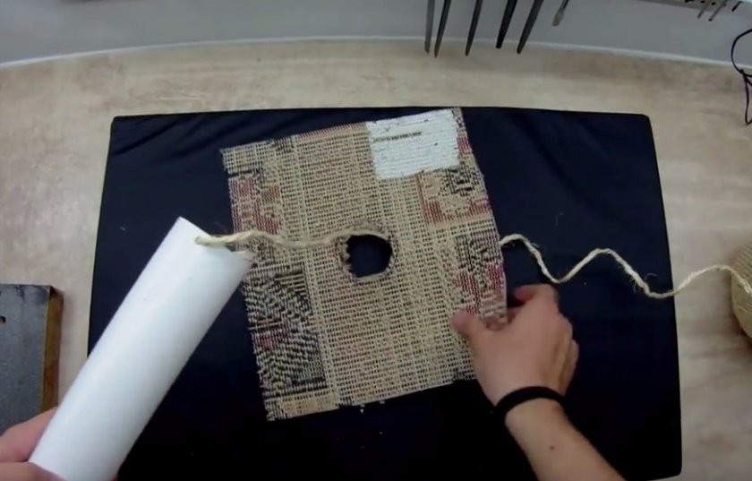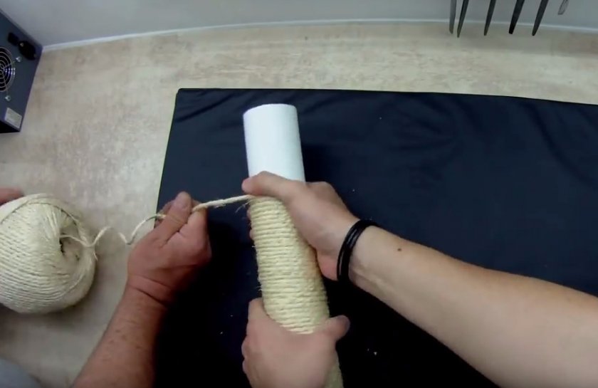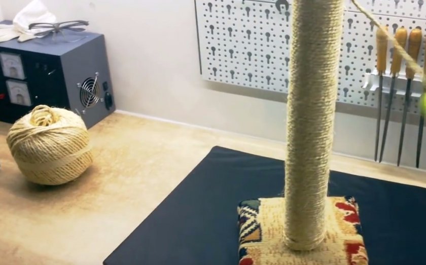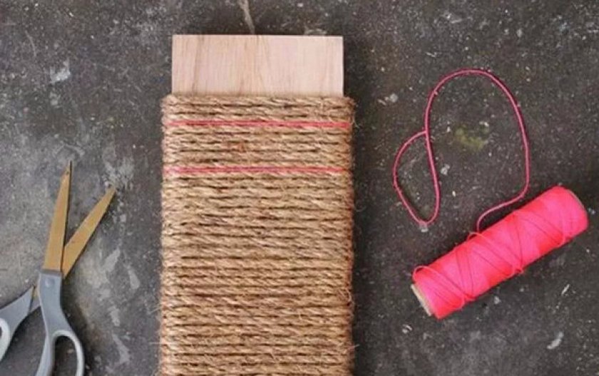 Основание можно сделать из фанеры в виде квадрата. Берем толстую нить, затем плотно и туго ее обматываем. Если вы переживаете за то, что котику удастся ее сорвать, можно сначала нанести специальный клей, а потом уже обматывать