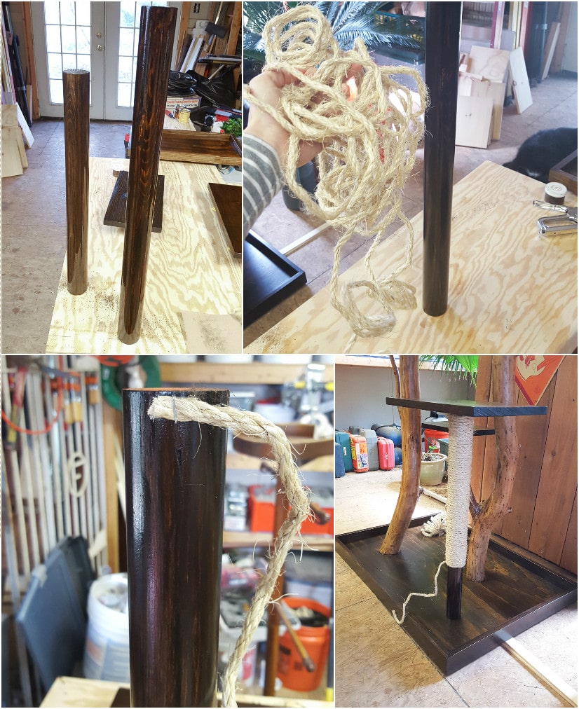 Мастерим и устанавливаем когтеточки. Для них используем деревянные дюбели, которые окрашиваем в тот же цвет, что и основание, после чего крепим по кругу сизалевые веревки.