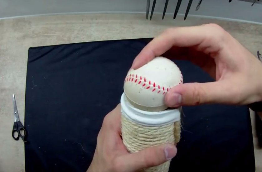 - Обмотать конструкцию верёвкой, периодически сажая её на клей, концы тщательно зафиксировать.