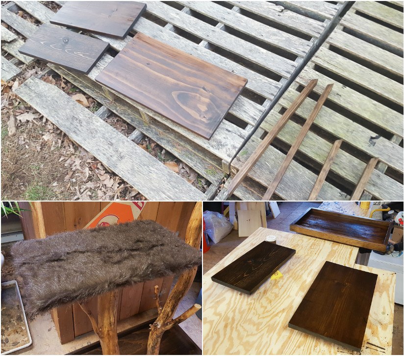Следующий шаг – создание платформ различных форм. В качестве основного материала используем сосну. Одну из полочек можно обить тканью с искусственным мехом. Нижние покрываем полиуретановым слоем, аналогично базе.