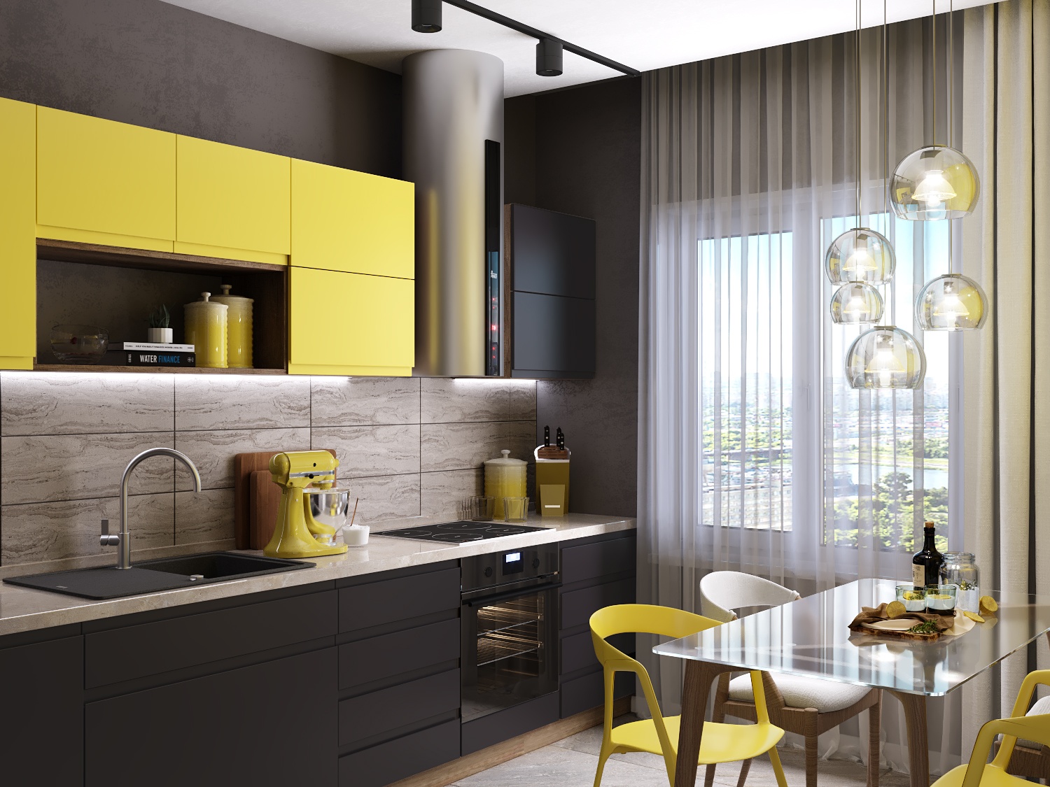 Для городских стилей применяют однотонные обои, крупные рисунки или геометрические узоры. Принт используется на одной из стен на кухне или на части стены для выделения функциональной зоны. Подходят все оттенки белого, дымчато-серый, небесно-голубой и другие пастельные бледные тона. Выбор зависит от того, какой цвет станет компаньоном темного дизайна. Например, для яркого желтого декора с серым кухонным гарнитуром хорошо будут смотреться стены в рапсовом оттенке, как на фото.